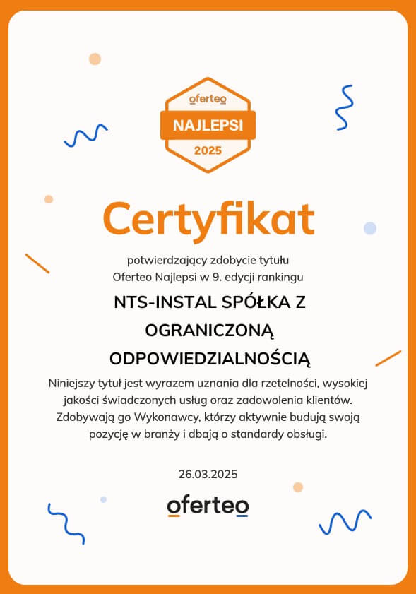 Poza montażem rekuperatorów, kotłów gazowych, klimakonwektorów, czy pomp ciepła. Zajmujemy się również instalacjami klimatyzacji w biurach i domach. Ponadto realizujemy usługi z zakresu wdrażania rozwiązań wodno-kanalizacyjnych i ogrzewania podłogowego(płaszczyznowego). O profesjonalizmie Zespołu NTS-Instal świadczą liczne wyróżnienia i nagrody. W 2018 roku zajęliśmy I miejsce od Johnson Control w kategorii największej ilości zamontowanych pomp ciepła Hitachi Yutaki, co roku wyróznienie jako Najlepisi w portalu Oferteo.
